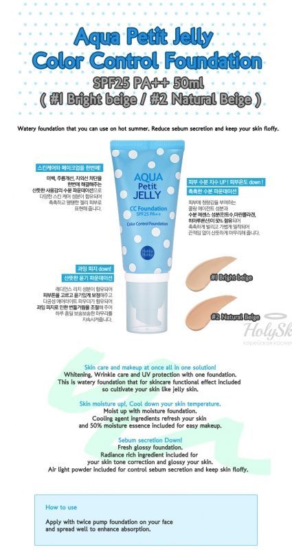 Специальное средство выравнивает и увлажняет любую кожу. Aqua Petit Jelly Color Control Base обладает густой желеобразной консистенцией, то есть проблем с нанесением и равномерным распределением у средства нет.